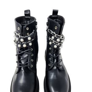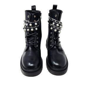 These ankle boots are embellished with silver chains & pearl-studded straps. Side zip closure allows these punk boots to be put on easily.