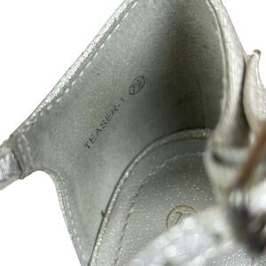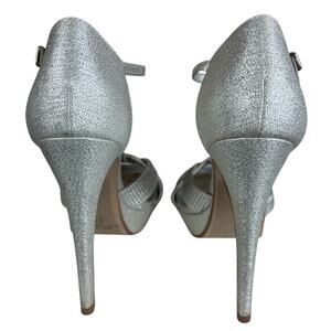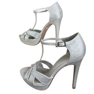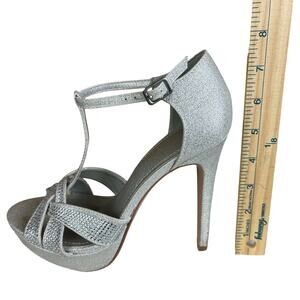 Details: Silver Glitter T Bar Pumps. Open Toe, High Stiletto Heels (5"), 1" Platform Sole, adjustable ankle buckle.