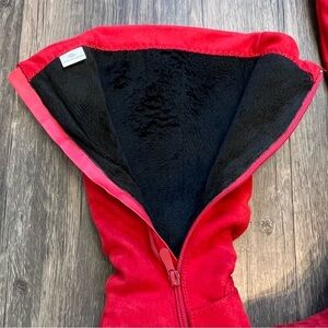 Beautiful and perfect for the holidays red suede with warm black fur interior lined, size full zipper and decorative gold with rhinestone buckle. They have some mild wear.