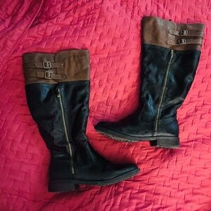 Black and brown faux-leather boots lined with warm fleece fabric. Wide-calf with low heel (1-inch). Very comfortable for women who normally wear size 12 shoes.