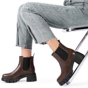 Dream Pairs Womens Brown Polyurethane (PU) Slip On Chunky Platform Ankle Boots