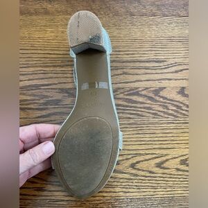 These Dream Paris sparkly silver shoes are a size 8, block heel with a single ankle strap. My daughter wore them one night for a homecoming dance and they are in great condition. The bottoms show minor wear just from wearing them outside.