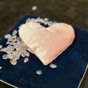 Rose Quartz dream pillow. Rose Quartz small gem stones Tin heart shape velvet pink fabric .This crystal has power to enhance positive affirmations. Can attract love and maintain harmonious relationships .Love Stone