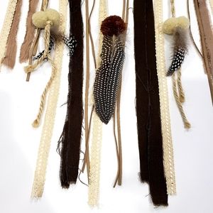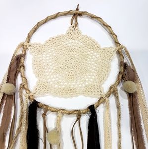 Dream catcher with crocheted middle and fabric hanging down with feathers and pom poms.