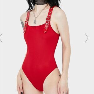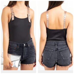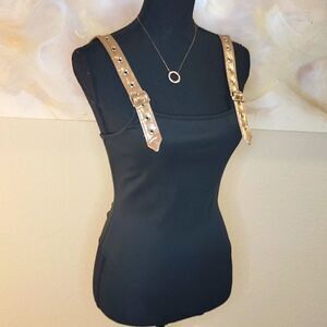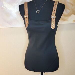 Black Soft Jersey Bodysuit with Stretch Fabric detailed with metallic Vegan Rose Gold Adjustable Pattern Leather Buckles with brief bottom.