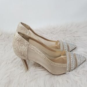 Heel is approximately 4". Near new condition. Nice fir summer, a heel where your foot can breathe. Size 6
