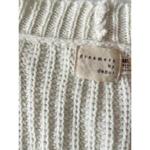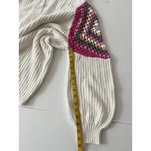 The Dreamers By Debut Open Cardigan Sweater in size M/L is a stylish and versatile piece for women. This white sweater features colorful crochet sleeves, puff sleeves, and a relaxed fit, making it perfect for casual occasions and travel. The sweater is made of polyester and has a ribbed knit style adding a touch of stretch for comfort. Hand wash only to maintain the quality and durability of this eye-catching sweater. Perfect for the winter, fall, and spring seasons, this cardigan is a must-have addition to any wardrobe.