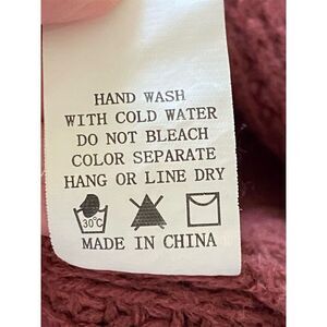 This Dreamers women's pullover sweater in size L features a solid dark mauve color and a V-neck design. Made from a blend of cotton and acrylic, it has a waffle knit texture and long sleeves, making it ideal for casual fall occasions. The sweater is crafted in China and requires hand washing. It is in good preowned condition with some slight pilling.