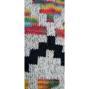 This cardigan is in good pre-owned condition with light signs of wear on fabric. No stains , tears, or piling.. Iy still has a lot of life left. This cardigan features stunning and contrasting geometric black and rainbow colored shapes, making it a show stopper