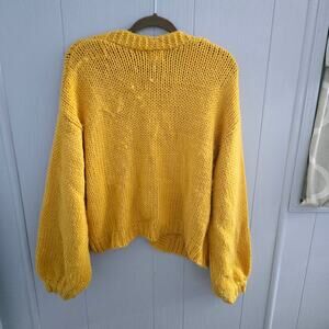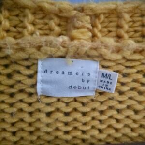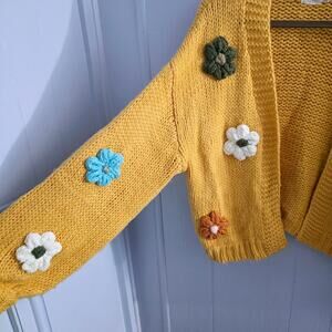 Dreamers by Debut chunky open-front cardigan in sunny mustard yellow with colorful 3D crochet flower appliqués. Size M/L, made from 100% acrylic with an oversized, cozy fit and balloon sleeves for extra charm. This piece mixes cottagecore, grannycore, and fairycore vibes with playful retro detailing—perfect layered over dresses or styled with jeans for a standout statement. Preowned with light overall wear, see photos for details.