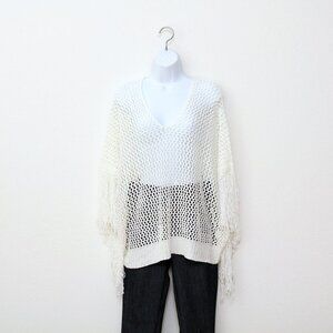 Dreamers by Debut Open Knit Fringe V Neck Poncho White Women Size S/M