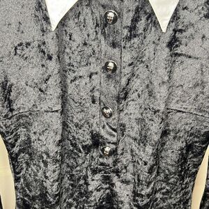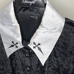 creepy in this costume that has a pointed collar with cross details, long sleeves and button closures on the front.