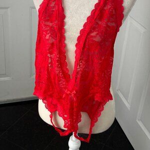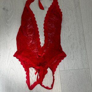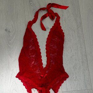 Dreamgirl Red Lace Peekaboo Strappy Teddy Bodysuit One Size – Halter Ribbon Tie