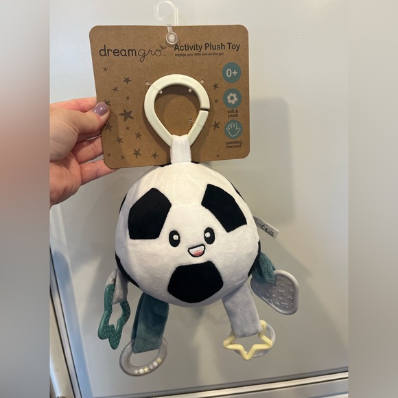 Soft and plush soccer toy with soothing textures. Features black and white colors with playful attachments.
