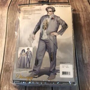 Dreamguy Halloween Costume “Got Cold Feet?” Size medium, brand new in package. Costume includes jacket and rose boutonnière, pants, and shirt-front sickie with attached bow tie.