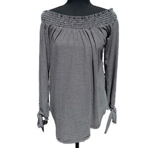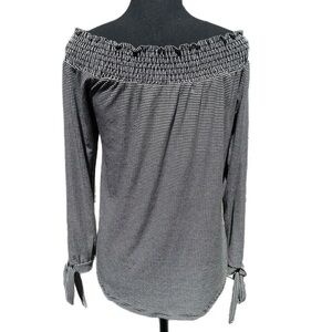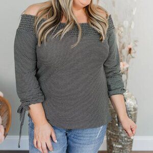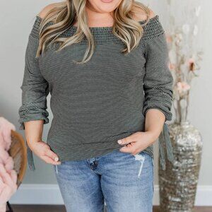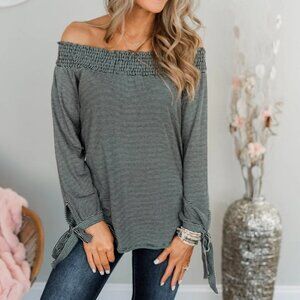 Add a boost of confidence to your day with this charming striped top! This work-friendly piece features a cinched neckline that can be worn on or off the shoulder and a tie detail on the cuffs! You're guaranteed to love your look with this seriously stunning top!