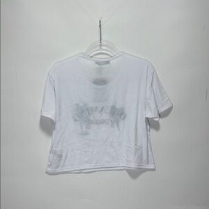 Chic white crop top with vibrant palm tree design. Casual and trendy style.