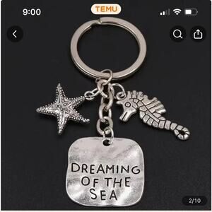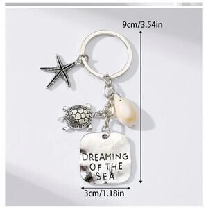 Beach fans unite!! This Keychain features is silver color with key ring charms including a Seahorse and Starfish with an engraved tag that reads " Dreaming of the Sea". It's lightweight and made of an alloy material. Please note: the black marks on the photo showing measurements is not a defect and does not show on actual product, simply caused by the lighting. Photo showing measurements is NOT actual item in this listing.