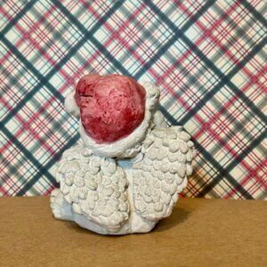 This adorable figurine shows a cherub sitting with his Santa hat on, ready to lend a helping hand during this busy holiday season. This was designed and signed (stamped) by artist Kristin Haynes on the bottom side of the figurine. It is made out of fine gypsum materials, hand painted and the cherub's hat has a white pompom glued to the end. It is in nice displayable condition with no breaks, cracks, or chips