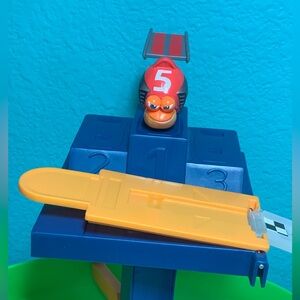 - Raised launcher works (though not always consistently). The bar attached to the ramp and triggered by the orange level sometimes slips out of place. When that happens pushing the orange level down gently to re-seat fixes it. Ramp can also be manually lifted from back to launch snail racer onto the track which may be easier for kids.