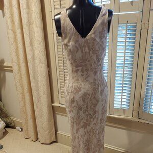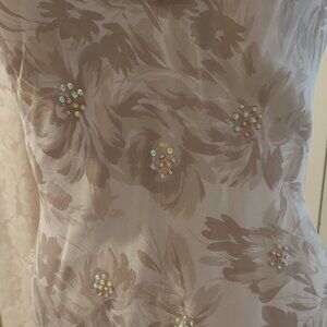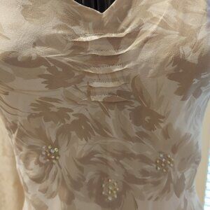 Heavenly to wear this beautiful simple gown is light as a feather. The colors are neutral in off white with pale shades of brown flowers and foliage. Both the outer layer and lining are silk and it just slips on with no zippers or buttons. The dress is displayed on a mannequin with a 34 1/2" bust, 27" waist and 36" hips and there is no room to spare. The length is approximately 51 1/2" from shoulder seam to bottom of hem on flat surface. Gently worn once. White House Black Market Size 6