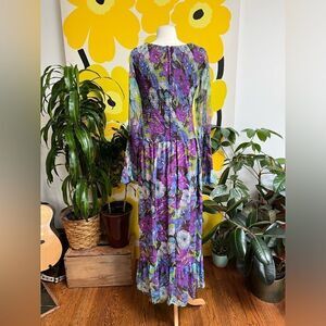 Dreamy 1960s 1970s Sheer Sleeve Smocked Floral Flowy Maxi Gown