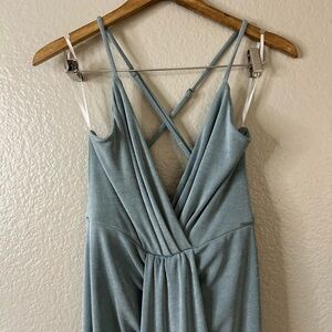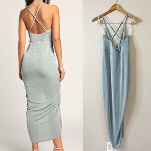 Lulus Dreamy Date Sage Blue Surplice Midi Dress! Textured stretch knit, with a bit of sheen, shapes this must-have dress that falls from adjustable straps (that crisscross in back) into a surplice neckline and a lightly gathered bodice. A fitted waist tops a draping midi skirt that creates a stunning silhouette before ending at a tulip hem.