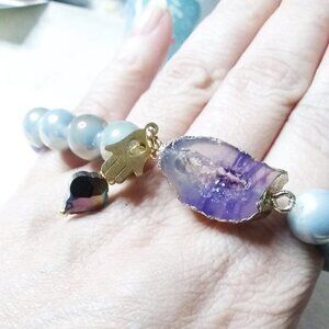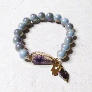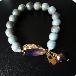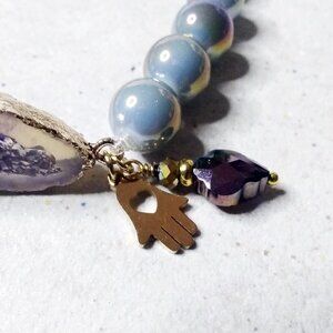 Dreamy! Iridescent Dove Gray Beads + Purple Druzy Bracelet! Gold Hamsa Hand!