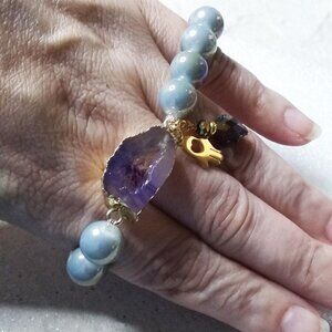 Those big, chunky gray beads shimmer from pale gray to a rich dove gray with iridescent purple glints. Have you ever held a dove tail or wing feather into the sunlight and see the colors play over it? Like that! The gold rimmed druzy center piece is partially transparent and depending on the light situation the color intensity goes from pale to darker purple. I added a 18k gold plated Hamsa Hand Charm as well as a electroplated purple faceted bead for a bit more bling and sparkle - creating a beautiful stretch bracelet for a more mature audience. This chunky elastic bracelet comfortably fits a 6.5-7" wrist.