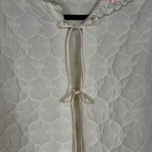 Features delicate all-over floral quilt stitching, pink embroidered flowers on the collar, and two satin ribbon tie closures. Wide sleeves with subtle pink trim give it a soft, romantic touch. Perfect for layering, lounging, or styling as a unique cottagecore outerwear piece.