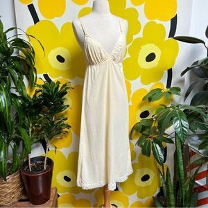 Dreamy Bohemian 1970s Pale Yellow Ribbed Knit Lace Trim Nightgown Lingerie