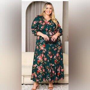 100% Rayon beautiful floral maxi dress with v neck and elasticized waist. This dress is a perfect foil for your favorite beautiful necklace, boots and leather jacket, Jean jacket, or card again. I have sizes 1X, 2X and 3X,