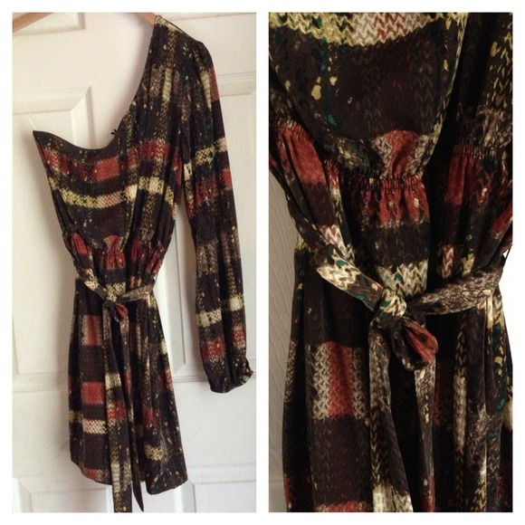 Soo cute!! One shoulder long sleeve , tie at waist , elastic below boob. Very sophisticated for work or night out!! One of my fav!! Material is polyester dry clean only