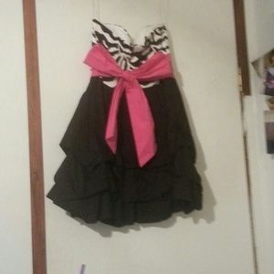Zerda, black, and pink. Has a tine tier in it but the pink bow covers it on the back.cute for a dance or party