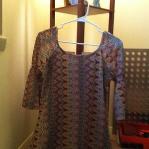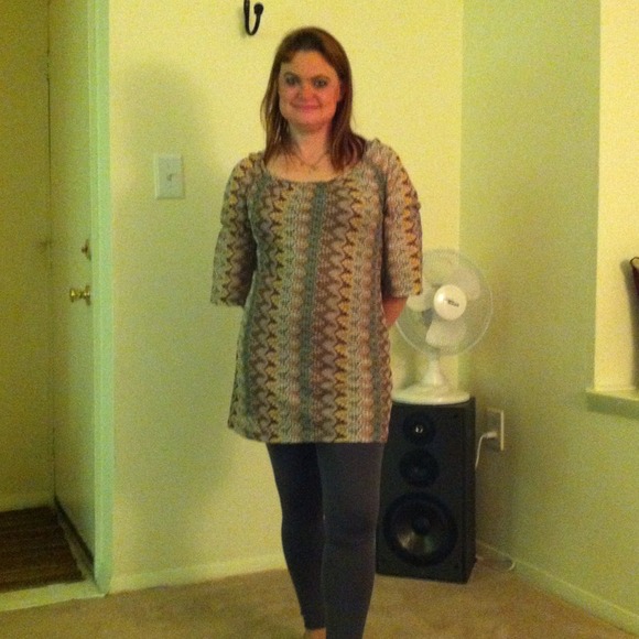 Lace like fabric lined dress. Beautiful colors with gold thread running throughout the dress. When the light hits it, it shimmers!! Bought only 3 months ago it's almost brand new. With current weight gain it no liger fits. Wear alone it pair with leggings or tights. Wish it still fit me!!