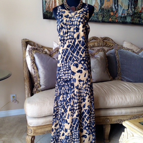 Lined 100% polyester carmel and gray tone and black multi print with some navy hues. 60" long bust 32" with some give I am 34 " around and it fits me. Nice drape.