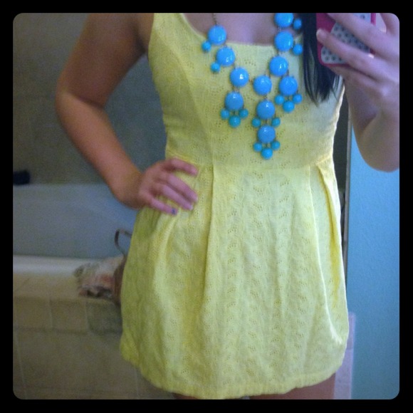 Yellow summer dress been worn a couple times zips up in the back and has flower designs on it! Size small! Zips up in the back! No tears or stains kinda short on me. I'm 5'5.