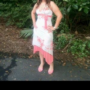 Its floral with acymetrical shape at the bottom and has a sheer layer. Its a beautiful dress