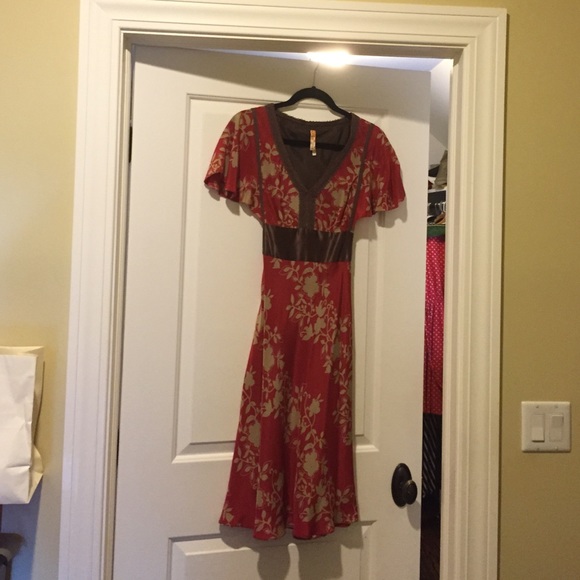 Rust print with brown lace trim, v neck, brown satin tie back, mid-calf length, wide sleeves.