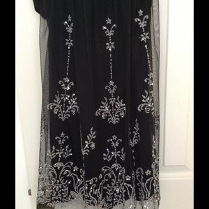 Black dress with Spaghetti straps, crinoline overlay with silver sparkle appliqué and a sash that ties in the back