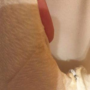 White dress from Francesca's with diamonds at the top and a deep cut back with a bow. There is a make up spot near the arm but can easily be removed in the wash. I wore this dress once and there are no rips or pulls.