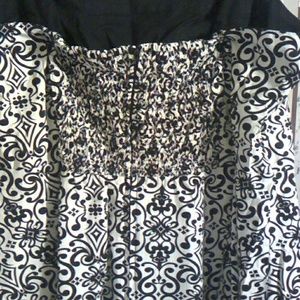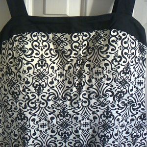Beautiful dress. 97% cotton 2% spandex. Black and cream. Size 12 fits true to size. 42.5 inches long from top of shoulder strap. The back is slightly lower on the shoulders and zips. Excellent condition.