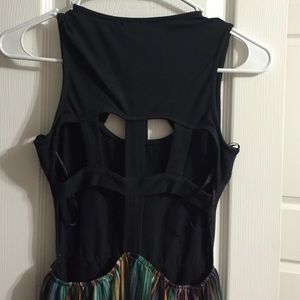 High collar / short front and long back for a sexy look with an open back. It's a lovely petite dress.