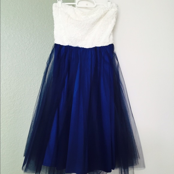 Very pretty navy blue and white tulle dress. Lace material on top and tulle on bottom. Knee length. Like new condition.
