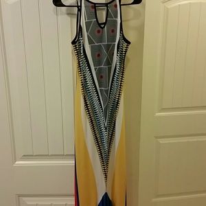Long flowing dress with asymmetric tail in the front of the bottom. Great colors!!