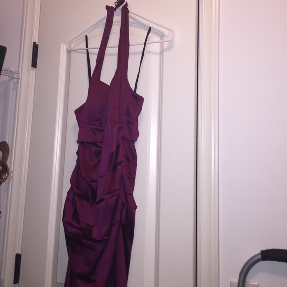 Wine colored dress halter, back out. Midi length.
