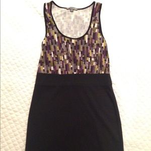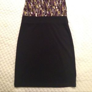 Mini dress with printed top and solid black bottom. This is cotton and stretchy. Great for a night out with some heels and accessories.