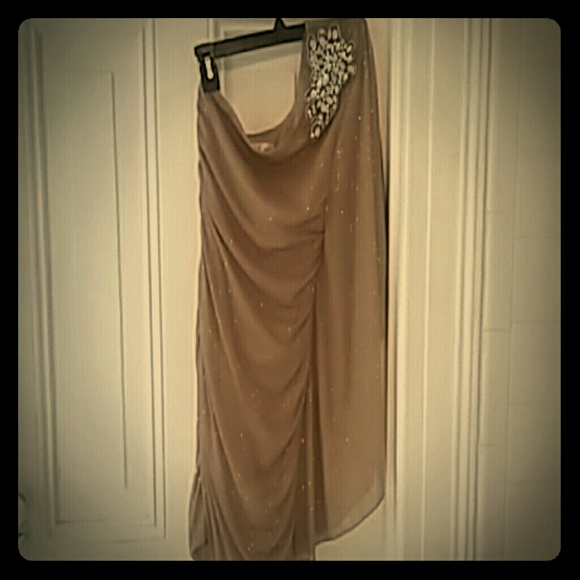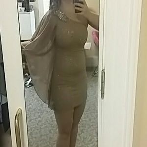 Short form fitting one sleeve dress Tan sparkles with rhinestones on the shoulder