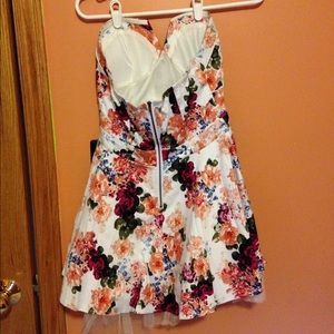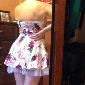 Padded chest piece, elastic around the top helps hold it in place. Strapless. Lace underskirt for flare. Great condition, only work once.