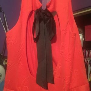 It's opened back & the opened back part makes a heart with a bow. Used ones looks brand-new. Not short & its flowy so it's not tight on the body. Like a peach/ Red color